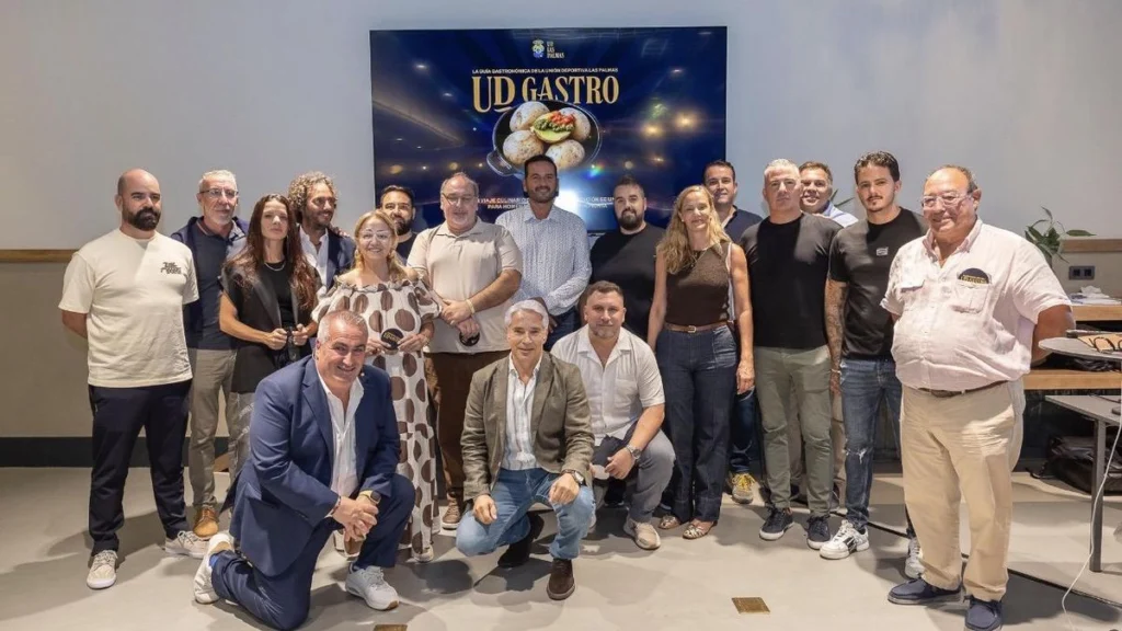 The event culminated with the attending restaurants featured in the guide receiving a sticker officially recognizing them as an “Establishment Adhered to the UD Gastro Guide,” followed by a group photo. The gathering brought together nearly a hundred people, including Minerva Alonso, Minister of Industry and Commerce for the Gran Canaria Council, Lluis Serra, Rector of the University of Las Palmas de Gran Canaria, other authorities, sector business owners, and members of the UD Las Palmas board and family.